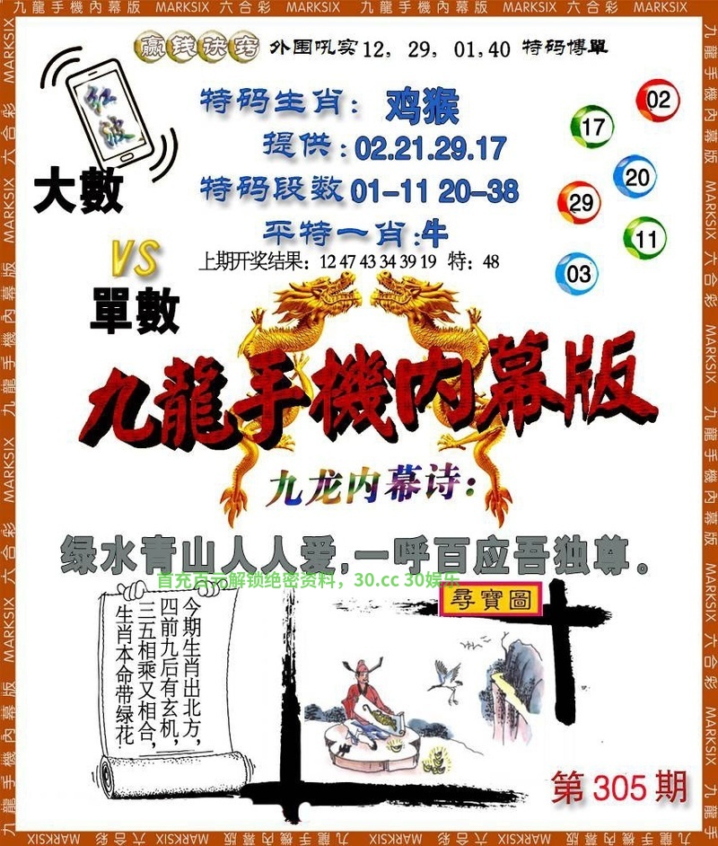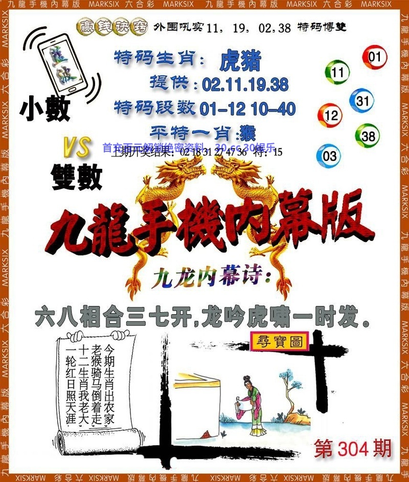 304期正版诗象(开马48) 六八相合三七开,龙吟虎啸一时发 推荐肖:虎猪马蛇狗牛 |